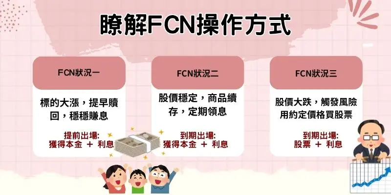 FCN(固定收益憑證)是一種結構型商品,通常是由銀行或券商設計, 它的報酬取決於「連結的股票或ETF價格變化」。