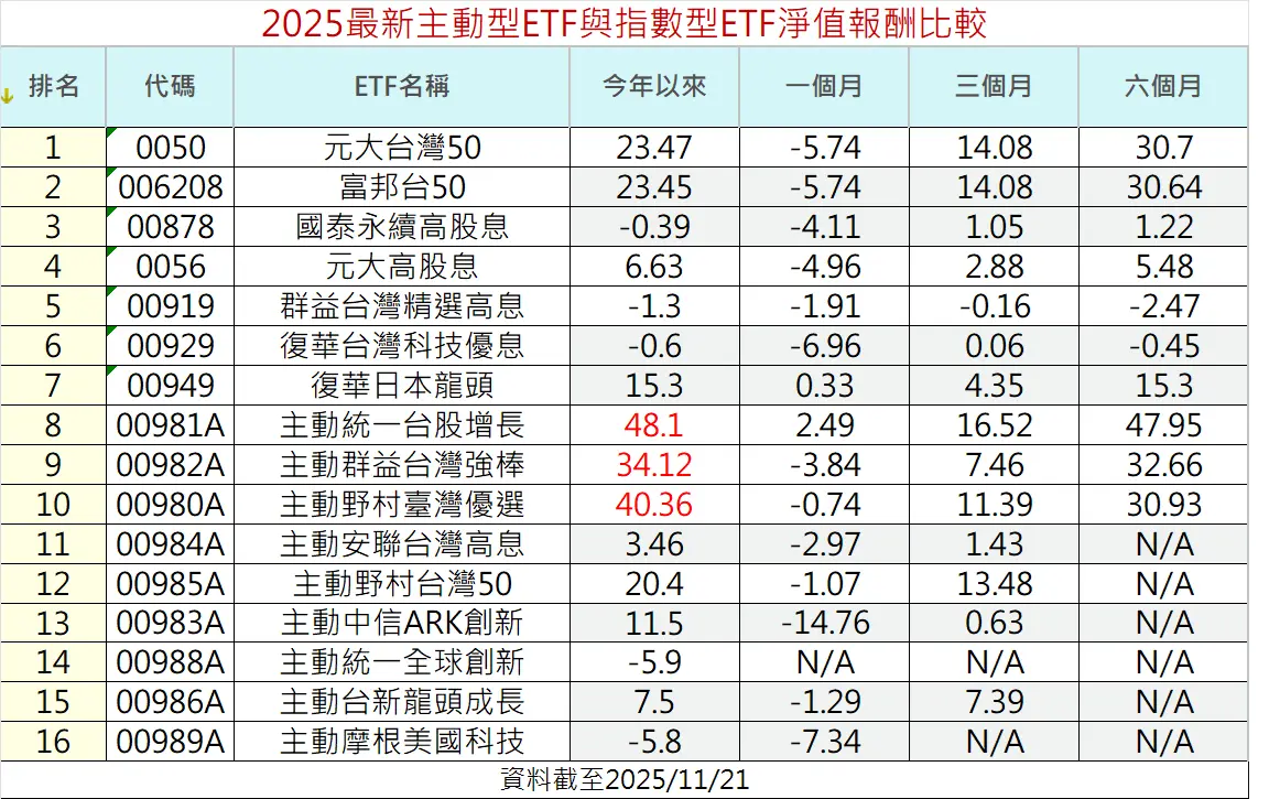 → 代表大型權值表現仍穩定,但比不上強勢主動 ETF 的攻擊力